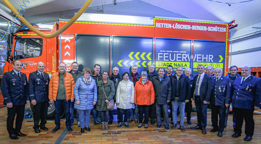 Der neue Rüstwagen macht Eindruck! Das war dem 1. Bürgermeister Frank Stumpf und den Mitgliedern und Freunden der Freien Wähler Naila, der Ü.W.G und der Parteifreien Bürger aus Marxgrün und Hölle bei ihrem Besuch der Freiwilligen Feuerwehr Naila deutlich anzumerken. Und das ist kein Wunder, wenn man den Ausführungen des Kommandanten Marco Wagenlechner folgt. Die Ausstattung des im vergangenen Jahr neu erworbenen Fahrzeugs, das nur mit drei Mann besetzt wird, ist so komplex, dass jeder Quadratzentimeter ausgenutzt werden musste. Denn die Aufgaben der ehrenamtlichen Feuerwehrleute sind in den letzten Jahren immer vielfältiger geworden, wie Vorstand Gerhard Wagenlechner erklärte. Mittlerweile geht das Aufgabenfeld weit über die Pflichtaufgabe der Stadt, für Brandschutz zu sorgen, hinaus. Deshalb ist es auch nötig für alle Eventualitäten gewappnet zu sein. Da hilft die Containerbestückung. Neben der Grundausrüstung werden in vier Containern, offenen Rollregalen ähnlich, die für besondere Rettungssituationen benötigten Gerätschaften untergebracht. Und um alle Funktionen zu beherrschen und nutzen zu können, waren im Herbst sechs Wochen lang an je drei Tagen Intensivschulungen nötig.